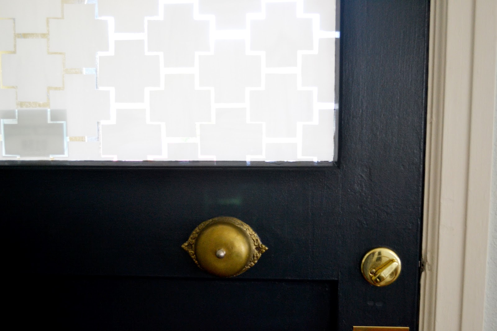 A couple things. First, this project total took a couple hours. Such an easy weekend update project. Second, I've always hated that our door fixtures are brass. But, we've never taken the plunge in replacing them because all our doors have brass fixtures. $$$$. Against the navy blue though? I don't so much mind the brass. Hmmmm. And third, yes, I had some fun with the window "covering". You can read more how to create you own decorative window film here..
